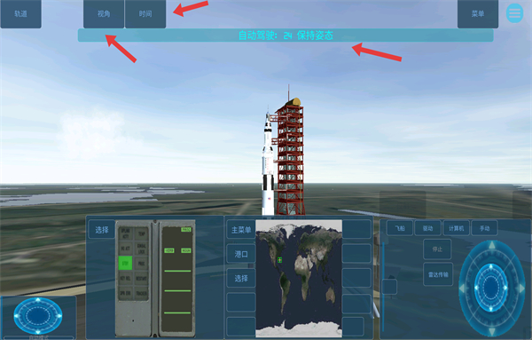 4、調整視角和時間設置開啟自動駕駛保持姿態,模擬火箭發射前的準備流程體驗航天模擬的真實感。