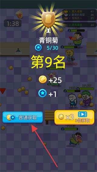 4、對戰結束后查看自己的排名和獲得的獎勵,如金幣和星級獎勵,點擊普通獲取按鈕,領取獎勵,也可選擇倍數獲取,積累游戲資源,用于后續游戲內的消費或升級。