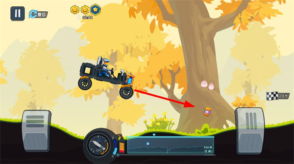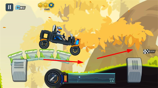 3、駕駛時點擊右側前進按鈕控制賽車前進,到起伏的地形上行駛,同時注意賽車的動力和行駛距離,完成任務。