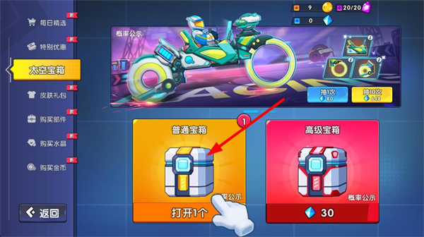 4、進入太空寶箱界面,可選擇打開普通寶箱獲取道具,也能使用水晶抽取賽車相關部件,收集道具來提升賽車的性能。