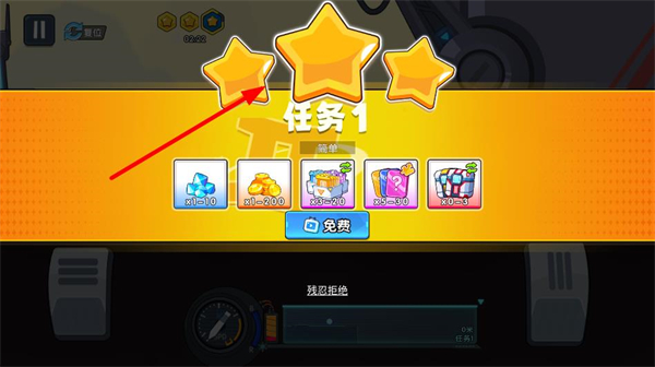 3、完成任務1后獲得三星評價,界面顯示對應的獎勵物品,可選擇免費領取獎勵,也可點擊殘忍拒絕跳過,繼續后續挑戰。