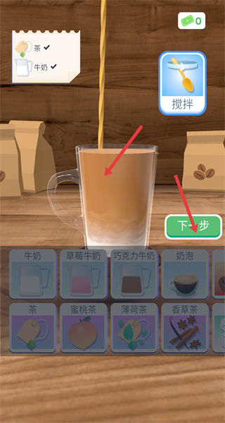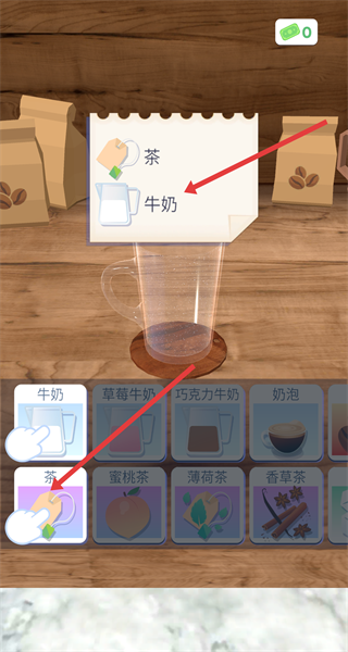 2、在制作界面,按照訂單提示選擇茶、牛奶等原料,依次添加到杯子里。