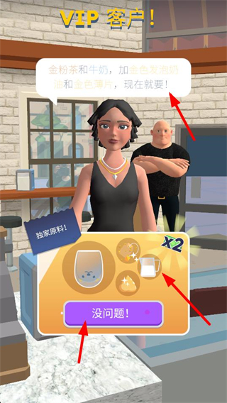 1、查看VIP客戶的需求,確認需要的金粉茶牛奶等原料,點擊沒問題按鈕接下訂單,開啟本次飲品的定制流程。