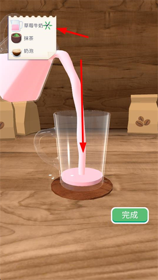 4、開啟新的飲品制作,選定草莓牛奶作為原料,將其倒入透明杯子里,待原料添加完成后,點擊完成按鈕推進流程。