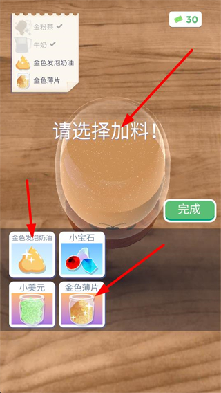2、進入加料環節,看到請選擇加料的提示,從下方選項里選定金色發泡奶油和金色薄片,將這些配料添加到飲品里。