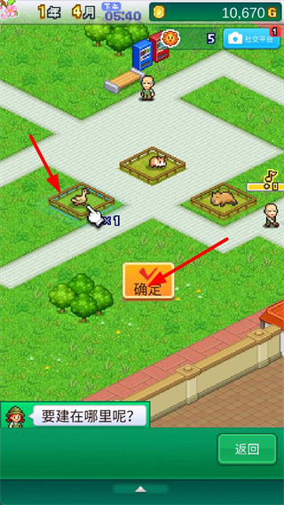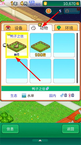 2、進入動物界面,可選擇已命名的動物設施,確認對應的花費后,即可準備在公園內布置鴨子的展示區域。