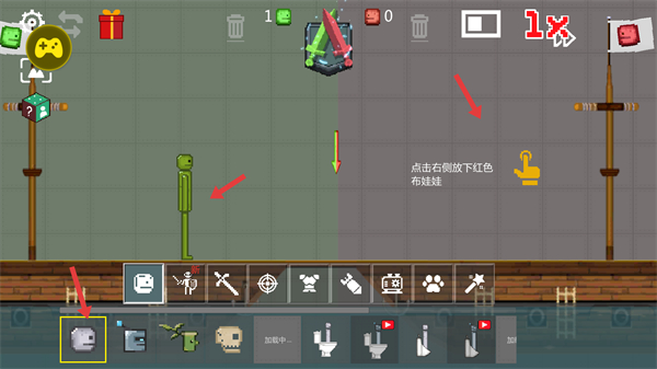 2、進入沙盒后在下方選擇布娃娃等元素點擊右側區域放置紅色布娃娃,同時可放置綠色布娃娃這是組建雙方陣營的基礎操作。
