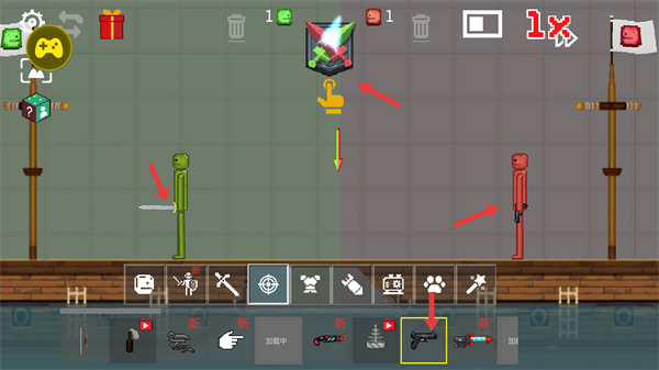3、為布娃娃配備武器如給綠色布娃娃裝備劍紅色布娃娃裝備槍,點擊上方的武器圖標來裝備提升雙方戰力然后觸發戰斗。