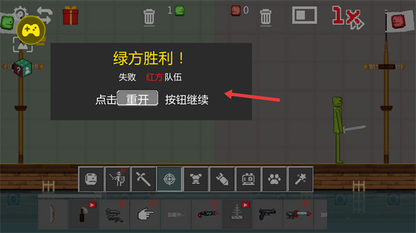 4、戰斗結束后若綠方勝利可點擊重開按鈕繼續游戲,調整布娃娃的配置和武器嘗試不同的戰斗組合提升游戲體驗。