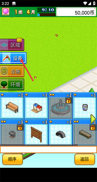 2、進入設備界面,挑選長椅、小建筑等設施,為公園建設準備所需物品。