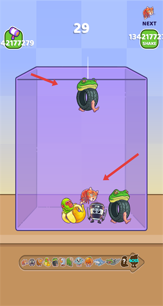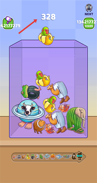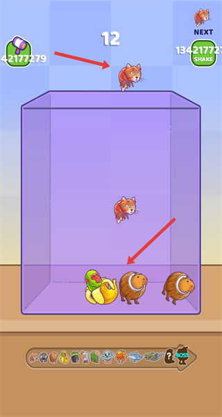 2、在界面,讓相同的動物掉落并合成,生成新的動物,逐步豐富容器內的動物種類。