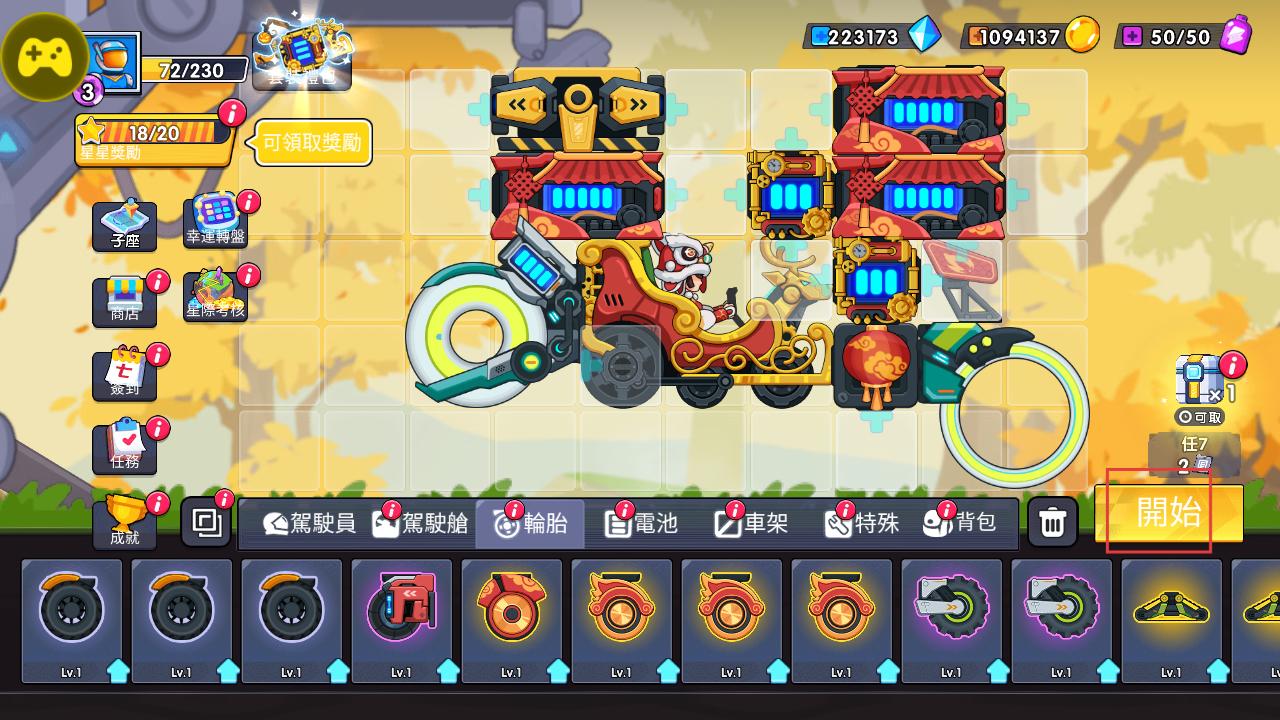 1、在車輛組裝界面,可搭配駕駛員、駕駛艙、輪胎等部件,組裝好后點擊開始,即可進入山地賽道開啟競速挑戰。