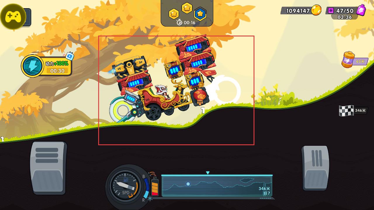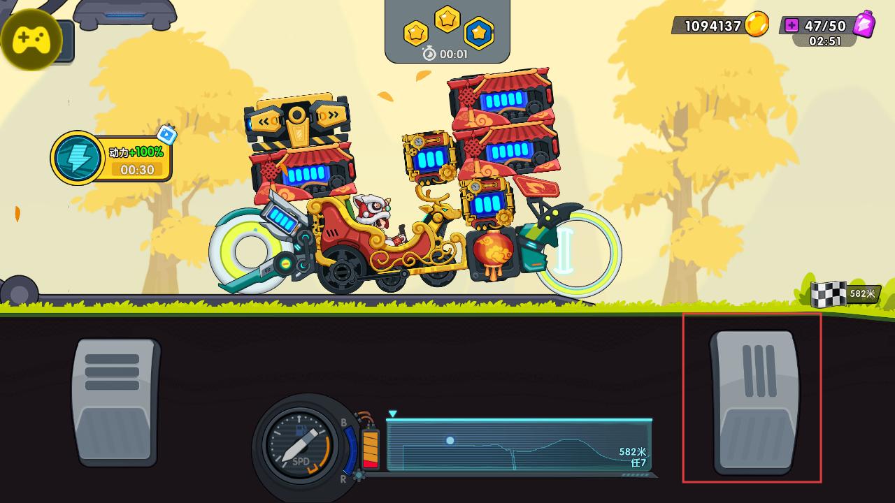 2、駕駛時操作油門踏板,利用動力加成在賽道上行駛,界面會顯示行駛距離和剩余時間,需在規定時間內推進進度。