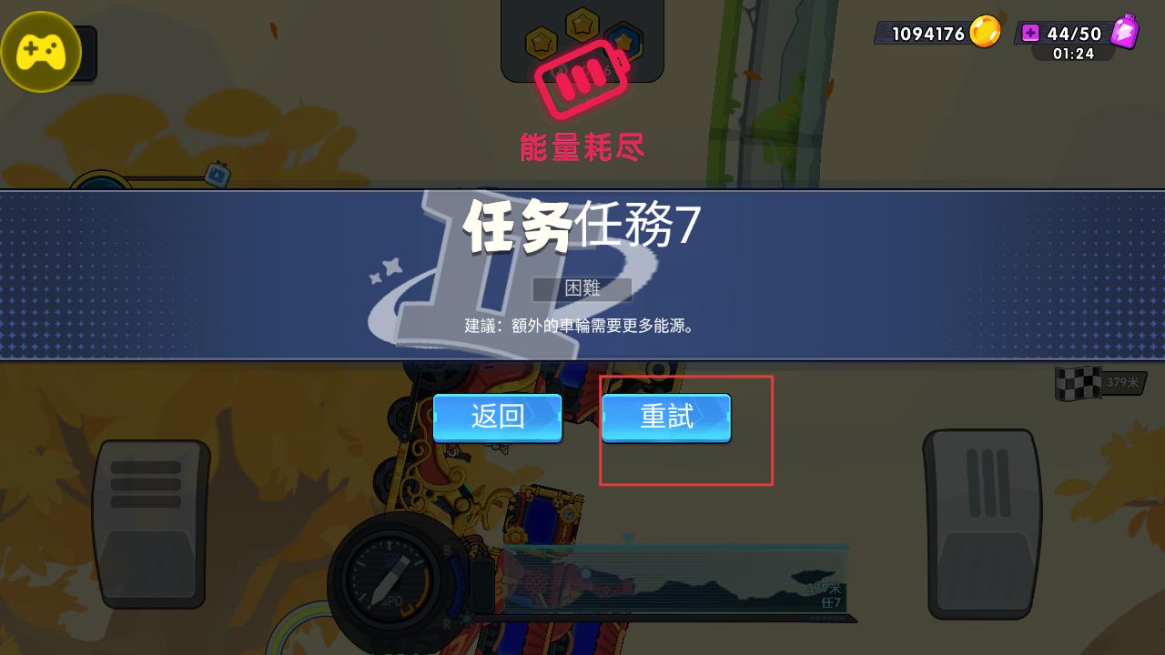 4、若行駛中能量耗盡,任務會失敗,此時可點擊重試重新挑戰該任務,或返回界面調整車輛配置后再嘗試,爭取完成任務。