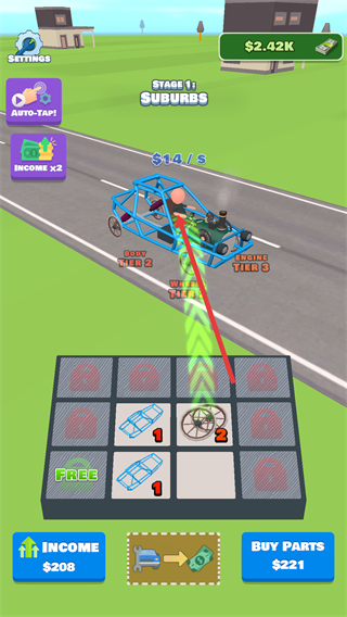 2、不斷升級汽車零件,提升每秒金幣收益,逐步完善汽車構造,為競速比賽做準備。