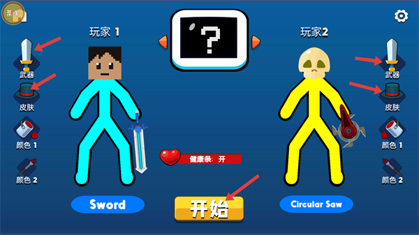1、進入游戲先在角色選擇界面可對玩家1和玩家2的武器、皮膚、顏色進行設置,設置好后點擊開始按鈕進入游戲。