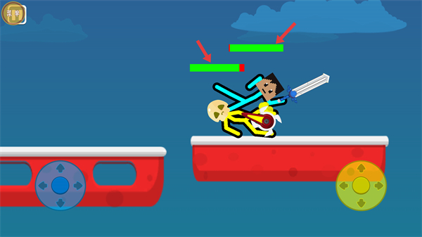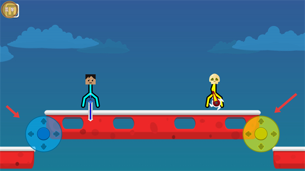 2、游戲中左側藍色方向輪盤控制玩家1移動,右側方向輪盤控制玩家2移動,通過輪盤操作角色在平臺上移動對戰。