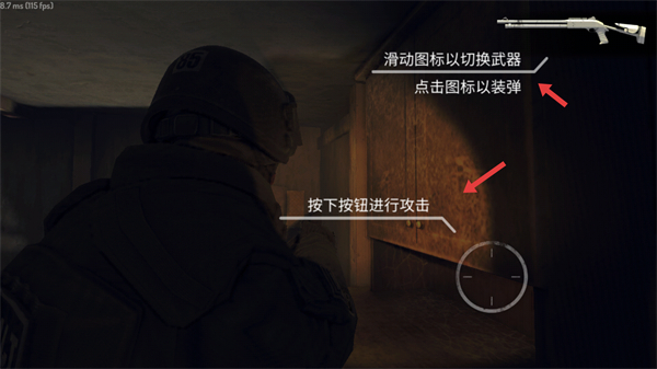 4、戰斗時可滑動圖標切換武器點擊圖標裝彈按下攻擊按鈕進行攻擊,合理運用武器操作有效打擊敵人。
