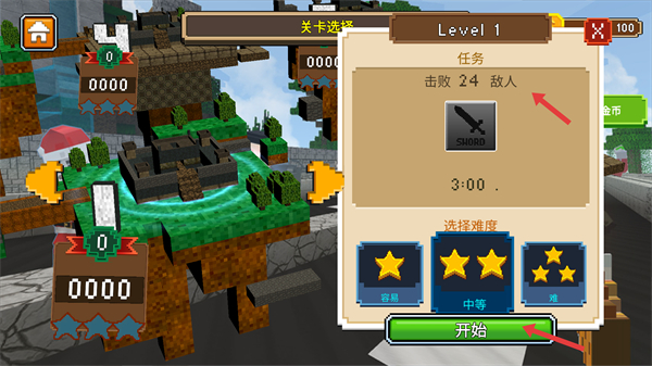 2、關卡選擇時查看任務要求如擊敗指定數量敵人,選擇合適難度后點擊開始即可進入關卡挑戰。