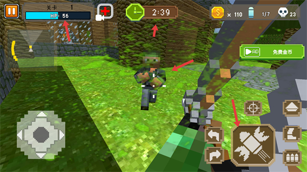 3、游戲中關注生命值時間和金幣數量利用武器攻擊敵人,合理運用道具和技能在規定時間內消滅敵人推進關卡。