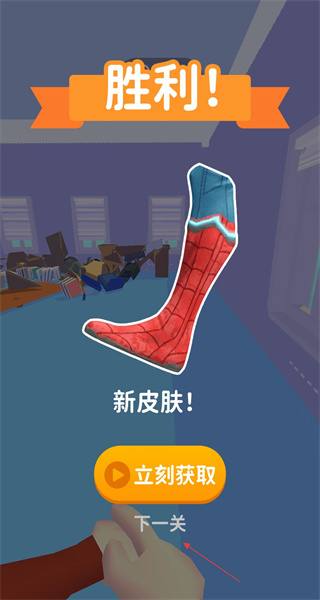 4、消除目標人物后,進入勝利界面,看到新皮膚獎勵和下一關按鈕,點擊下一關,開啟后續關卡的追捕任務,完成關卡2的通關操作流程。