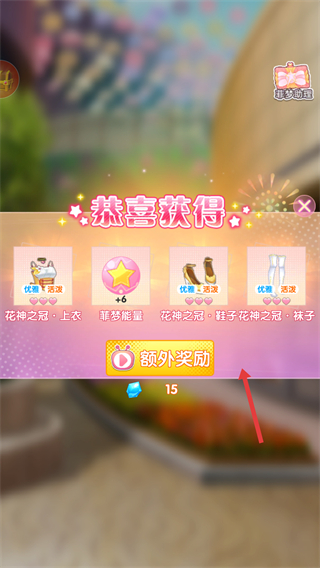 4、成功通關后系統會自動彈出獎勵界面包含限定服飾、菲夢能量、金幣等資源,點擊額外獎勵可獲取更多資源用于提升角色和裝扮。