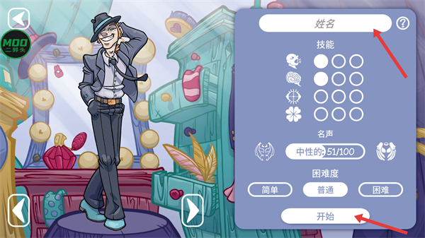 1、進入初始界面先設置好角色的姓名、技能、名聲和困難度,然后點擊開始,開啟當鋪經營之旅。