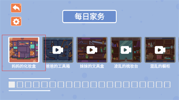 2、玩家每個場景包含多個關卡如媽媽的化妝盒、爸爸的工具箱,可以體驗不同物品的收納挑戰。