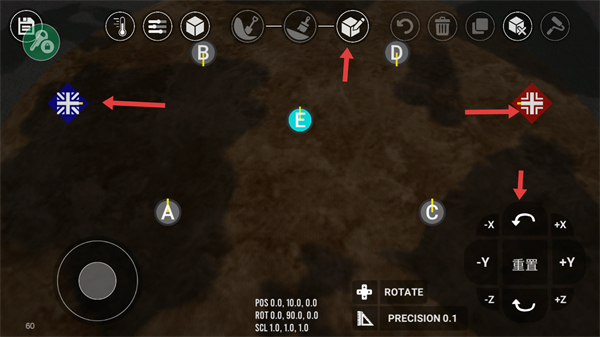2、在地圖編輯界面利用上方工具調整據點位置,通過旋轉、重置等功能設置地圖元素打造布局合理的戰場地圖。