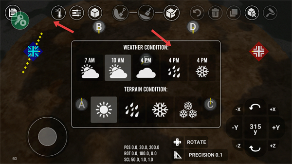 4、點擊天氣圖標選擇不同的天氣和地形條件如晴天、雨天等,改變地圖的環境氛圍為戰斗增添更多變化。