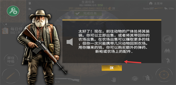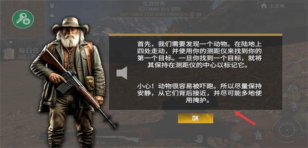 2、閱讀狩獵提示了解需使用測距儀發現動物,保持安靜從背后接近并利用掩護點擊OK開始實踐狩獵技巧。