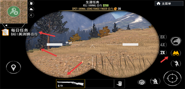 3、使用測距儀觀察發現目標動物后保持其在測距儀中心標記,同時留意每日任務按任務要求狩獵美洲獅等動物。