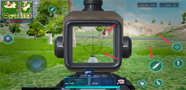 4、瞄準敵人射擊利用瞄準鏡提高命中率消滅敵人積累擊殺數,同時關注存活人數推進戰斗爭取最終勝利。