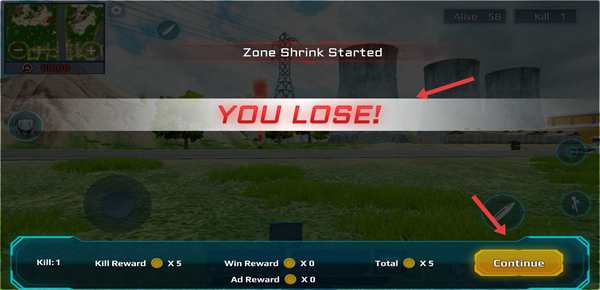 1、戰斗失敗后點擊Continue繼續總結擊殺1人的經驗積累金幣獎勵,為下次戰斗調整策略提升生存和戰斗能力。