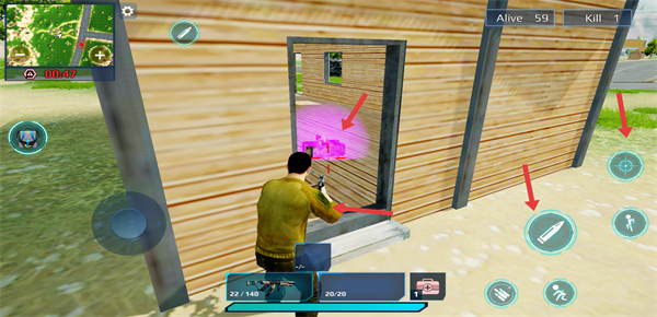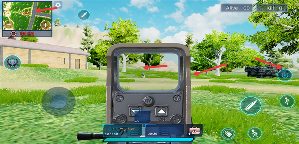 3、利用地圖查看敵人位置通過瞄準鏡瞄準敵人射擊提高命中率,消滅敵人積累擊殺數同時關注存活人數推進戰斗。