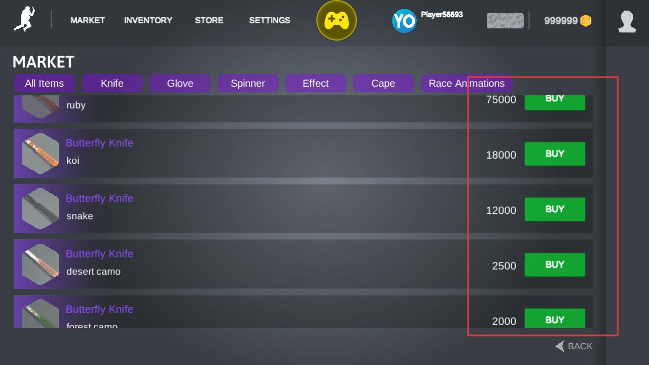 2、在市場界面,可花費金幣購買蝴蝶刀、手套等道具,提升角色裝備,為跑酷闖關增添助力。