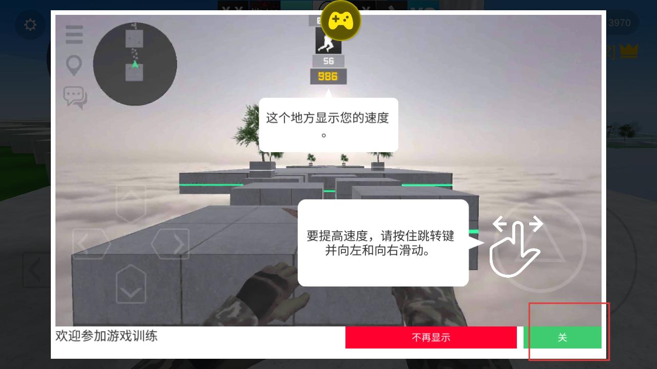 3、游戲訓練教程會提示操作方法,按跳轉鍵左右滑動可提高速度,關閉提示后即可開始跑酷訓練,熟悉操作技巧。