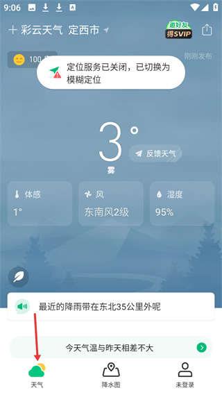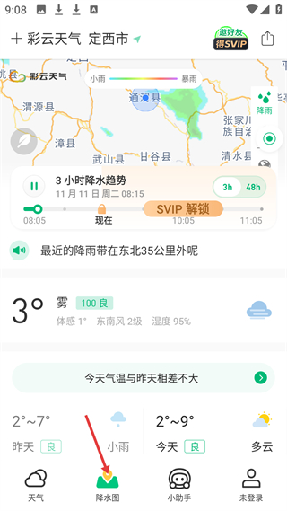 3、降水圖板塊提供定西市降水地圖,展示3小時降水趨勢,用戶可查降雨帶位置,SVIP解鎖更多時長降水趨勢查看。