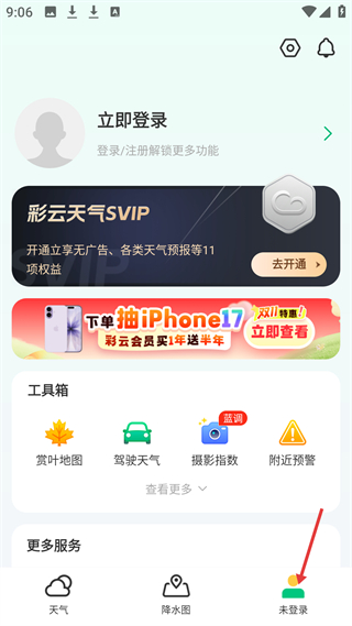 4、未登錄板塊可登錄解鎖功能,有SVIP開通入口享無廣告等權益,工具箱含賞葉地圖等服務,提供天氣工具和會員權益。