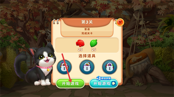 1、點擊右下角綠色按鈕進入關卡選擇,選擇第3關,點擊開始游戲開啟消除挑戰。