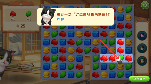3、游戲中可通過L型收集制造炸彈,觸發大范圍消除,高效完成收集目標,獲取獎勵。