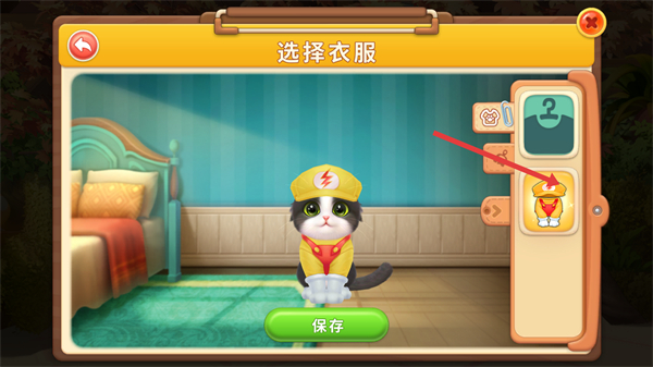 4、進入選擇衣服界面,挑選多樣服飾如閃電套裝為貓咪裝扮,點擊保存完成個性化造型。