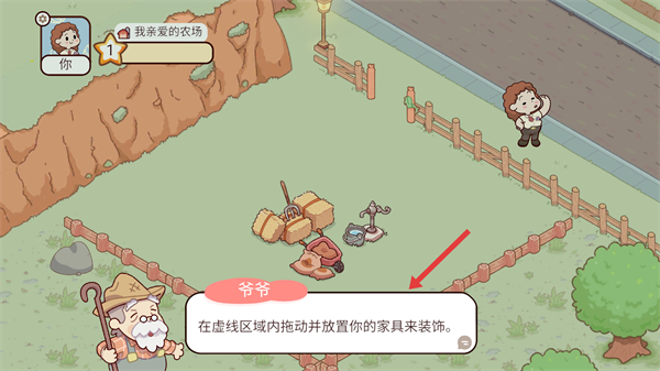 1、根據提示在虛線區域內拖動并放置家具來裝飾農場,按照指引操作逐步打造屬于自己的農場環境。