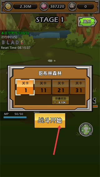 1、選擇關卡1點擊戰斗開始進入哥布林森林的戰斗場景,開啟冒險之旅學習戰斗操作和技巧。
