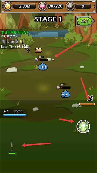 2、在戰斗中面對藍色史萊姆怪物利用武器攻擊,注意觀察怪物的血量合理使用攻擊技能逐步消滅怪物。