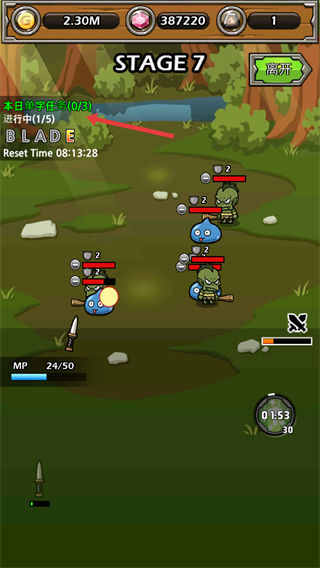 4、推進到關卡7面對哥布林和史萊姆等多種怪物,合理規劃攻擊順序完成本日單字任務獲取獎勵提升角色實力。