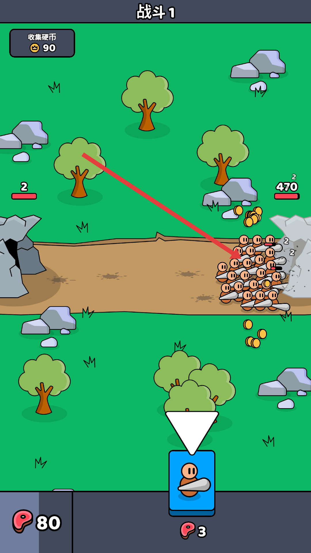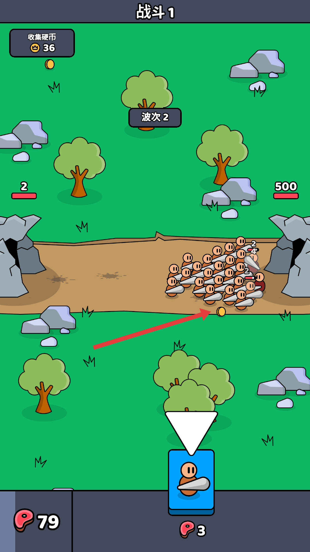 3、持續派遣小兵,可壯大我方兵力,攻破敵方的巖石防御,同時繼續收集金幣,提升資源獲取量。