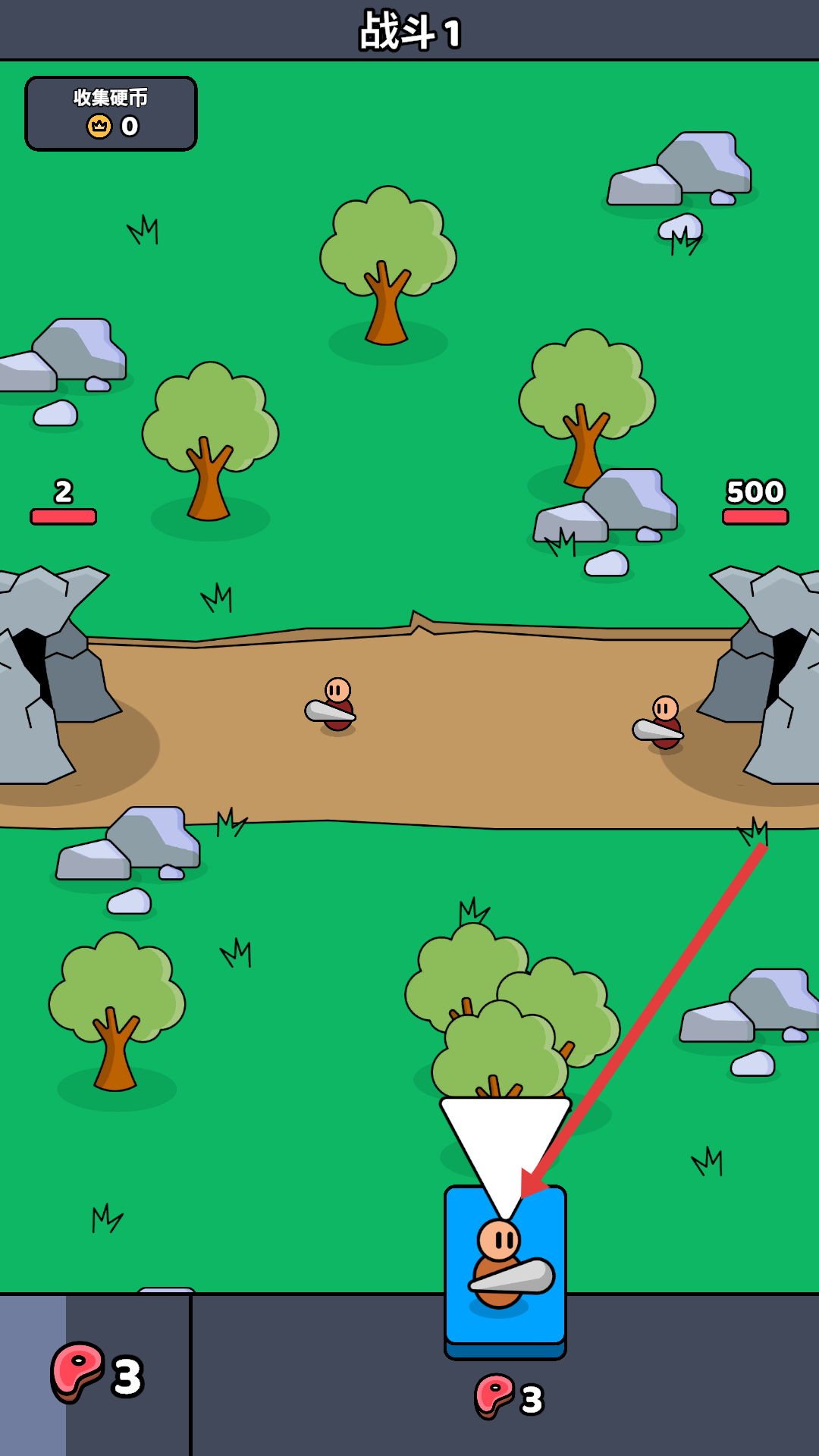 1、進入戰斗1場景,可看到帶有武器的小兵卡牌,點擊該卡牌,可派遣小兵參與戰斗,開始對抗敵方小兵。