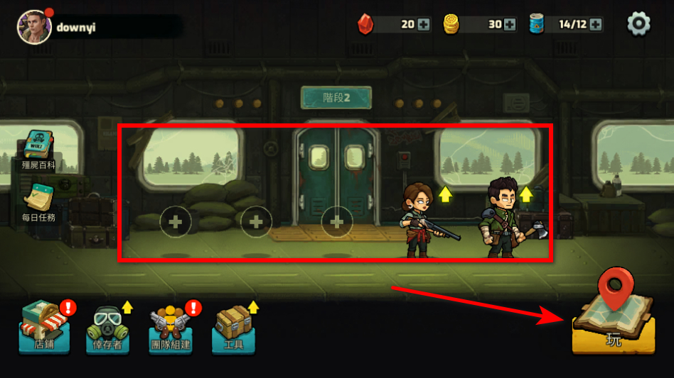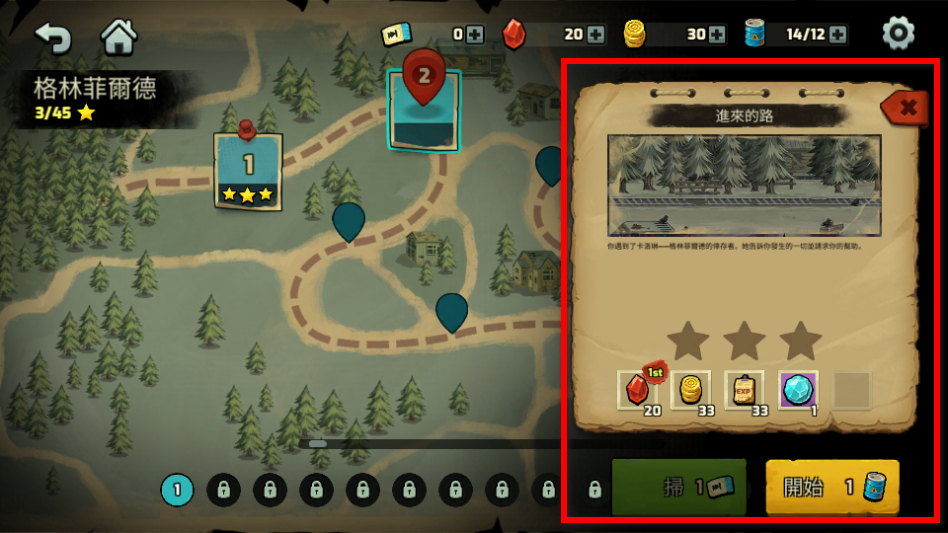 1、在大廳可組建隊伍,查看階段進度,點擊右下角玩進入地圖界面,選擇關卡前可查看關卡相關信息。