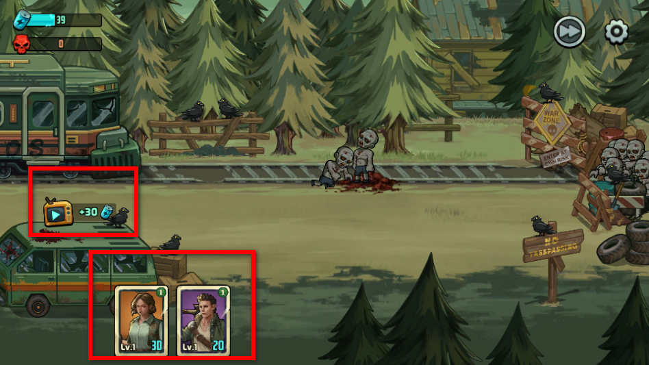 3、戰斗中操控角色移動躲避僵尸,角色自動攻擊,可收集道具提升戰力,同時能獲取角色卡牌提升等級屬性。